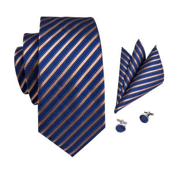 This beautiful blue silk tie with copper stripes is a timeless addition to your tie collection. The elegant striped pattern gives the necktie a sophisticated touch. The fabric reflects light beautifully, further enhancing the luxurious design created by the color combination of blue and copper and the striped pattern.